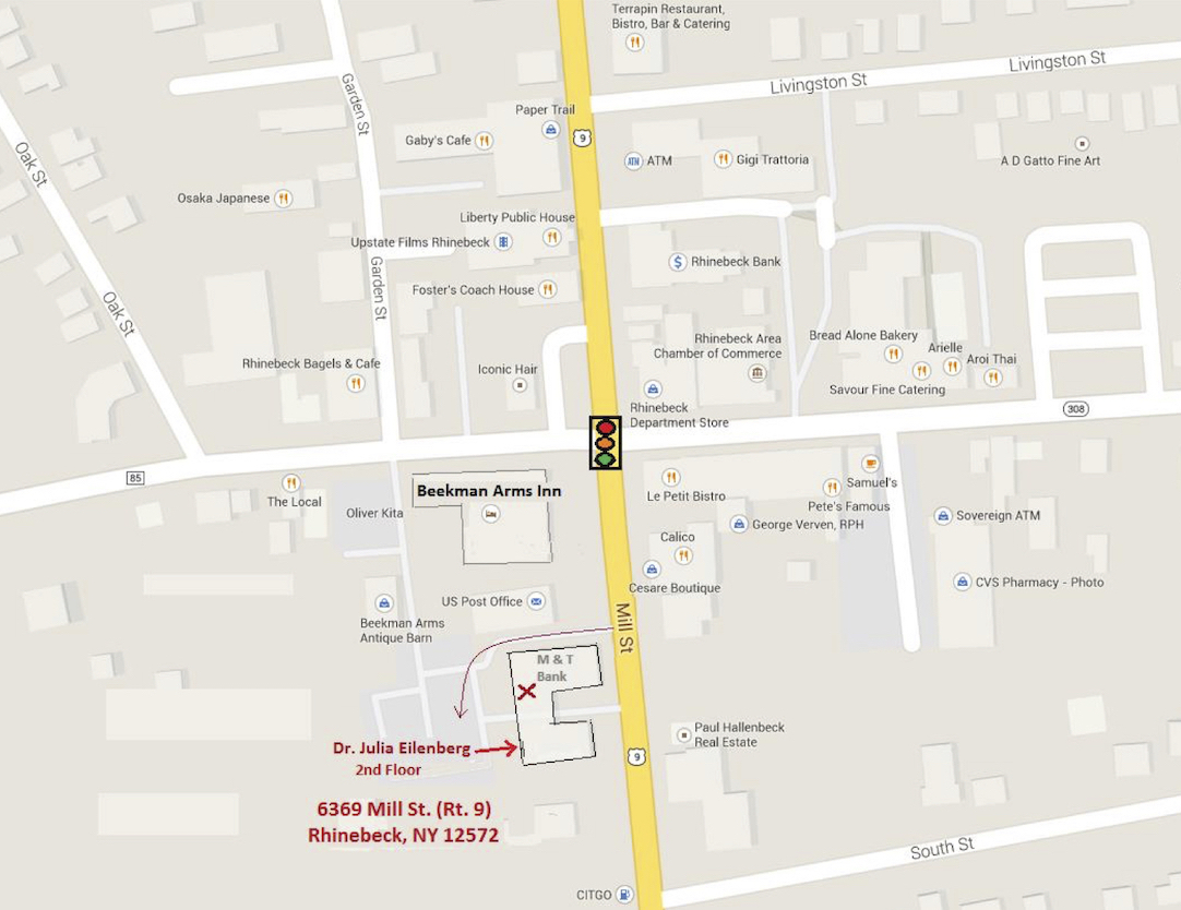 The office building is on Route 9, just south of the Beekman Arms hotel. Drive into the parking access between the Rhinebeck Post Office and the M&T bank. The entrance to my suite is from the rear (parking lot). Take the stairs at the entrance and turn left to find the suite on the left hand side of the corridor. Enter the door labelled "Waiting Room".